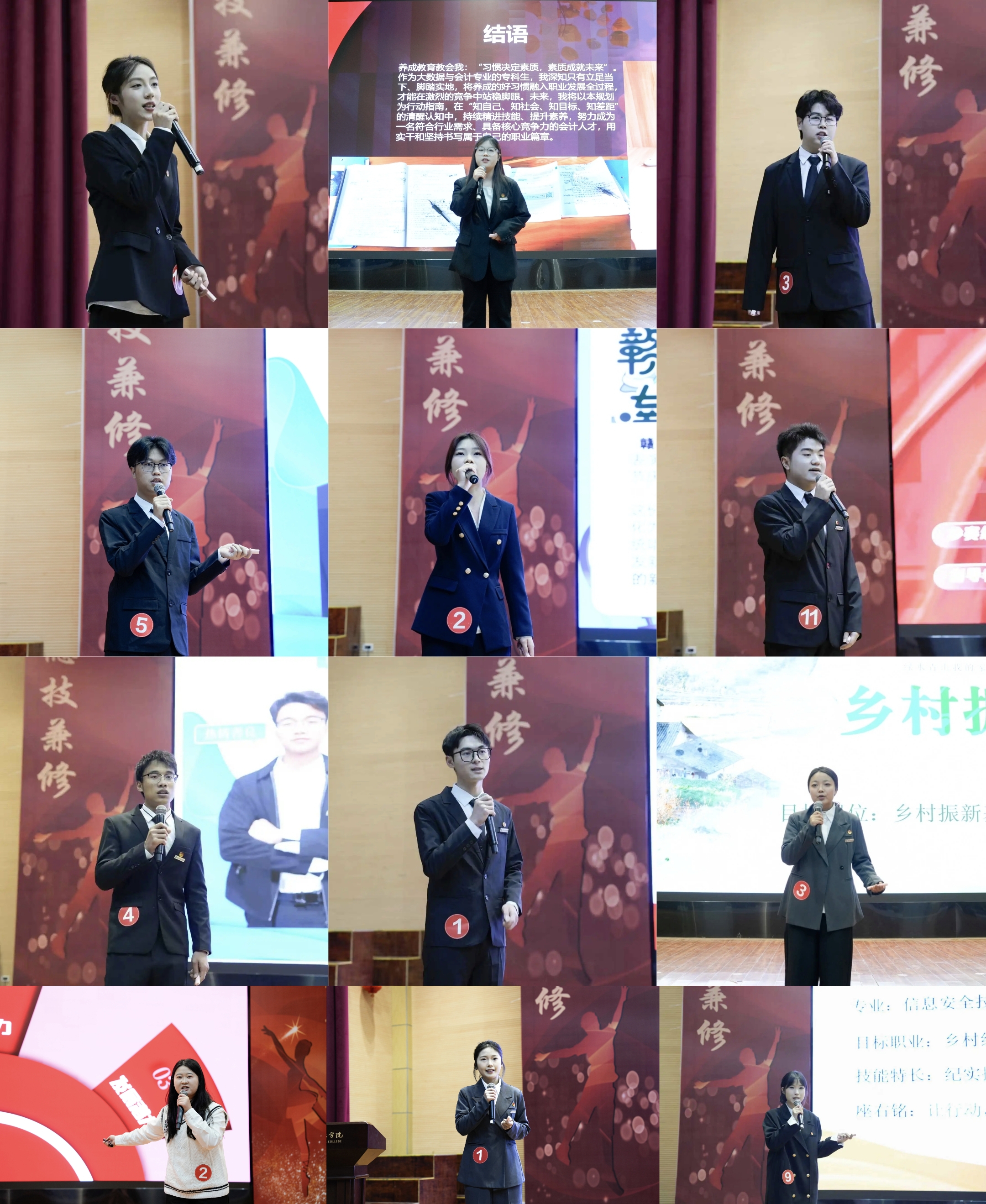 本次决赛设置“成长赛道”与“就业赛道”两大竞赛板块,共有15名优秀选手脱颖而出参与角逐。成长赛道的选手们围绕职业目标确立、行动能力提升、规划优化改进等核心内容展开全面阐述,展现了清晰的成长路径与发展潜力;就业赛道的选手则聚焦岗位胜任力与职业发展潜力,通过求职陈述与综合面试环节,充分展现了扎实的专业素养、良好的沟通能力与明确的职业定位。整场比赛中,选手们自信从容、表达流畅、规划详实,赢得了评审团与现场观众的一致好评。