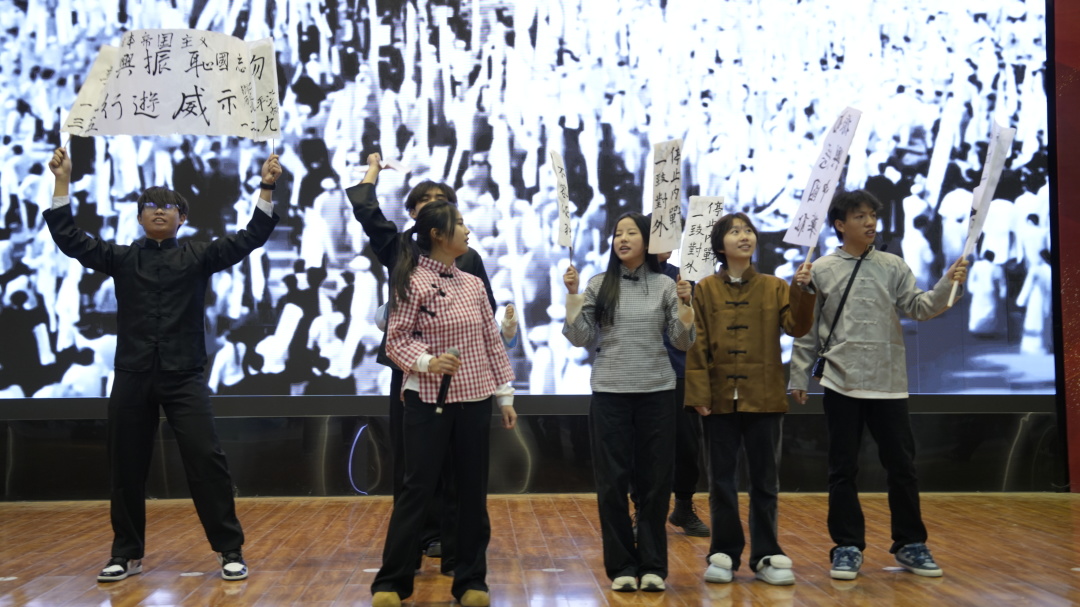 六个由师生精心编排的节目精彩纷呈:开场歌舞《党旗飘扬的方向》以优美旋律和曼妙舞姿,诠释了对党的无限忠诚;情景剧《薪火》生动再现历史场景,点燃青春热血;演讲《传精神薪火·赴家国盛景》饱含深情,抒发新时代青年报国壮志;情景剧《穿越时空的对话》《觉醒年代》以创新形式连接历史与现实,引发师生对初心使命的深刻共鸣;压轴合唱《如愿》《我爱你中国》以激昂歌声将现场气氛推向高潮,表达了对革命先辈的深切缅怀和对祖国的无限热爱。